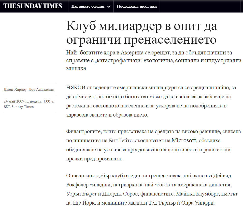 И така, свръхбогатият създател на един от най-важните световни новинарски канали - канал, на който много в Америка и отвъд са предали отговорност за мисловните си процеси - мисли, че има прекалено хора и те консумират прекалено много от световните ресурси, които явно трябва да бъдат запазени за такива като него. Читателю - мислите ли, че този човек, напълно сериозен във вярванията си, няма да действа според тях?