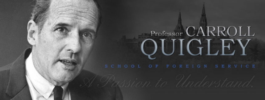 Роден през 1910-та г., Куигли завършва престижното Латинско училище в Бостън, а после защитава докторат по история в Хардвардския университет, след като учи физика за бакалавърската си степен. Куигли дълги години преподава история на цивилизациите в университета Джорджтаун, където традиционно се образоват американските дипломати и където той става легенда. Професорът публикува два големи труда през своя живот. Единият се нарича Еволюция на Цивилизациите (1961) и обсъжда аналитичен подход за изучаването на световните цивилизации, които неминуемо претърпяват възход и падения. Другият труд на Куигли е неговият магнум опус - Трагедия и Надежда (1966), световна история покриваща последния век.