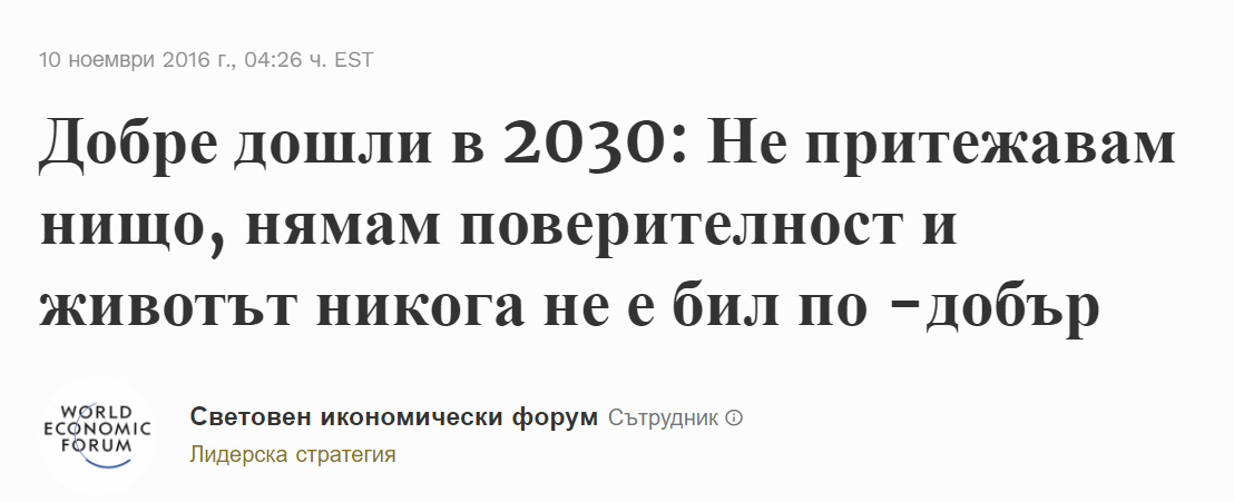 Какво значи да не притежаваме нищо? Ще обясня накратко каква е идеята тук; а вие можете да намерите детайлите в предходната книга на проф. Шваб и неговия Форум, "Четвъртата индустриална Революция" (2017).