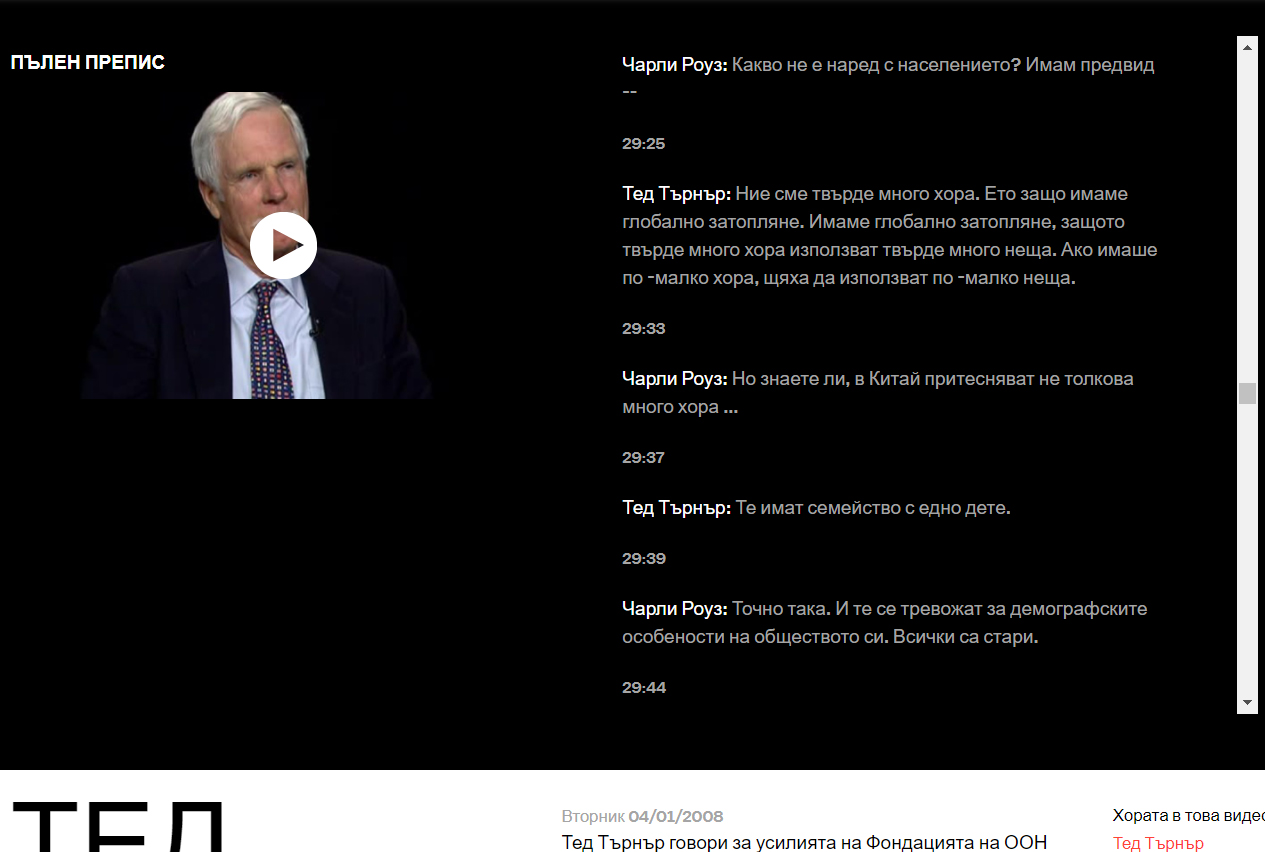 Тед Търнър: Има твърде много хора. Ето защо има глобално затопляне. Има глобално затопляне, защото твърде много хора използват твърде много неща. Ако имаше по-малко хора, те щяха да използват по-малко неща.